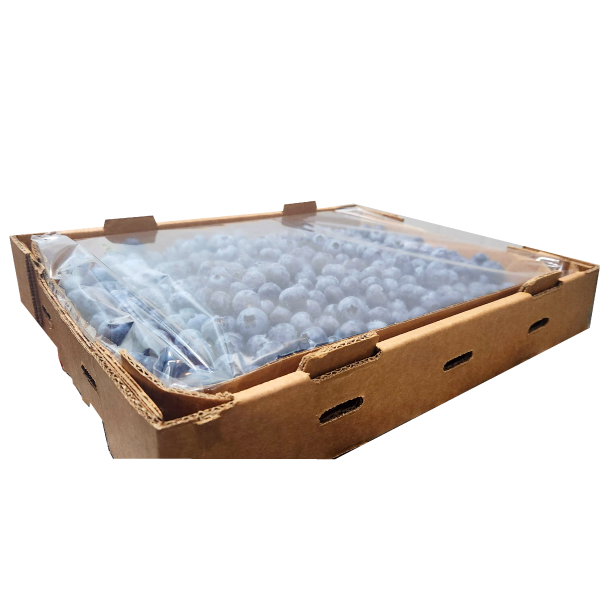 La Bolsa Pallet Macroperforada está diseñada para el almacenamiento y transporte de arándanos, optimizando la retención de humedad y el control de condensación.